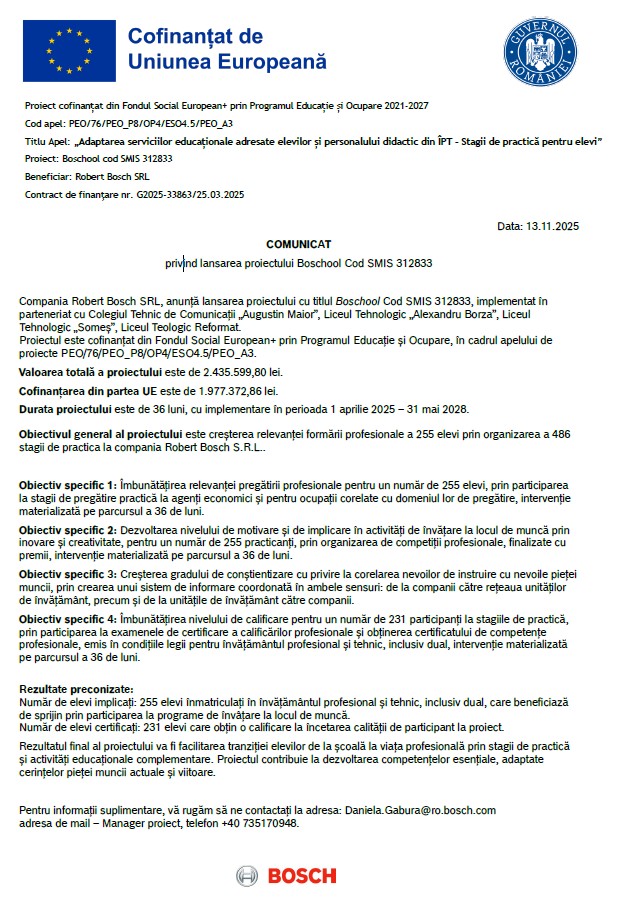 Proiect IPT din cadrul PNRR – „Dotări moderne pentru învățământul profesional și tehnic”